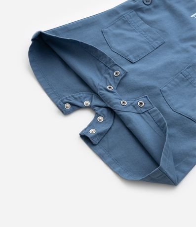 Jardineira infantil confeccioanda em sarja de material e processo mais susetentável. Possui alças ajustáveis, fechamento lateral por botões, fechamento no entrepernas, bolsinhos e bordado de bichinhos no parquinho.