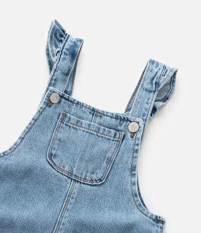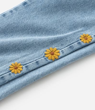 Ref: Jardineira comprida com babadinho nas alças, botões frontais e nas laterais, confeccionada em jeans com algodão certificado e detalhe em margaridinhas bordadas.