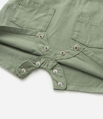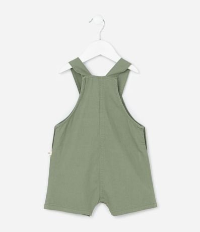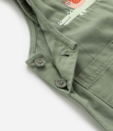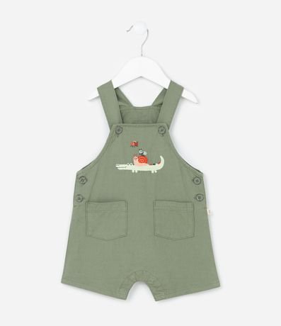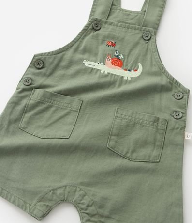 Ref: Jardineira infantil confeccionada em sarja mais sustentável, no modelo curto. Possui decote quadrado, alças largas, com botões, bolsinhos e estampa bordada de crocodilo e caracol.