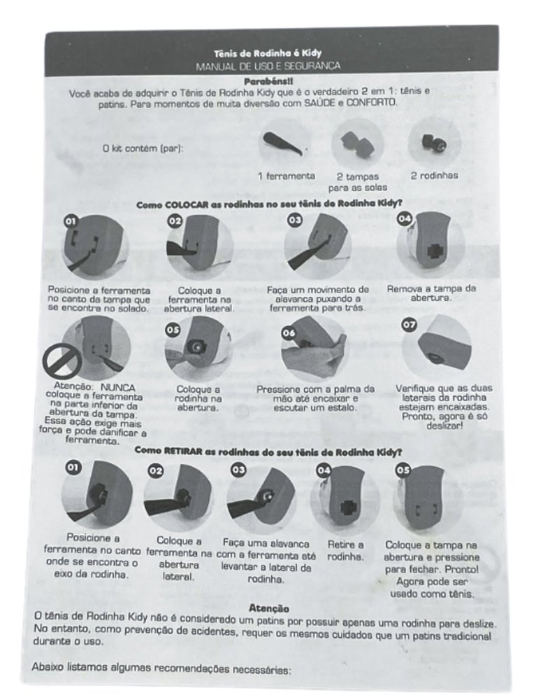 Ref: Tenis Com Rodinha Kidy, luzes de LED na sola. Ele pode ser usado com ou sem as rodinhas, pois vem uma tampinha. Acompanha 02 rodinhas, 01 chave removedora e 02 tampinhas para usar o tênis sem as rodinhas.