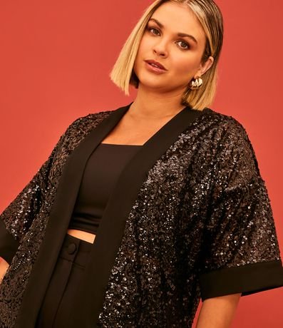Ref: Kimono em malha de paetê com abertura frontal, mangas curtas e viés de cetim,