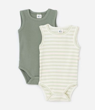 Ref: Kit com 02 bodies infantis confeccionados em ribana mais sustentável, gola redonda, regata, fechamento no entrepernas, 01 canelado sem estampa e 01 canelado com estampa de listras.