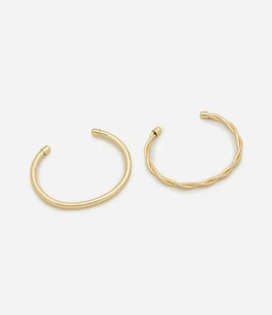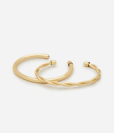 Kit com 2 braceletes femininos feitos em metal com banho light gold. Os modelos têm abertura lateral para facilitar o encaixe no pulso. Um deles possui acabamento liso e o outro traz detalhe entrelaçado, criando contraste no conjunto.