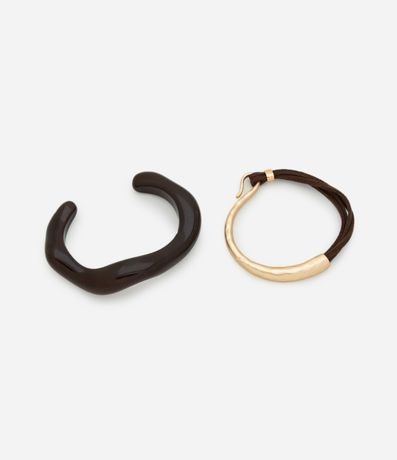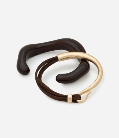 Ref: Kit feminino com dois braceletes. Um é moldado em resina com formato orgânico e abertura lateral. O outro combina metal texturizado com tira de suede. As peças podem ser usadas juntas ou separadas, criando diferentes composições modernas.