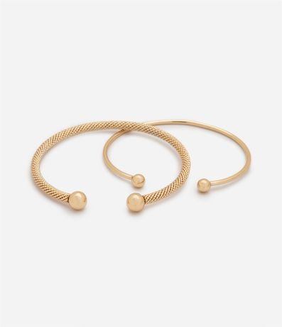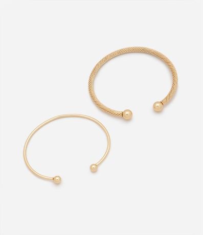 Ref: Kit com dois braceletes rígidos em metal, com aberturas, pontos redondas, um liso e outro texturizado.