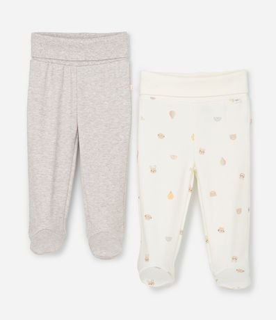 Ref: Kit infantil com 02 calças confeccionadas em algodão certificado BCI e boas práticas ambientais. As peças possuem cós dobrável para melhor ajuste e pés integrados. Uma calça apresenta estampa mini ícones e a outra é lisa mescla, ambas com toque macio ideal para o bebê.