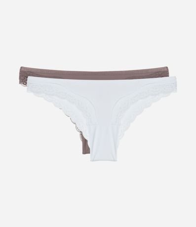 Kit com duas calcinhas de microfibra modelo biquíni. A peças têm detalhe de renda nas cavas.