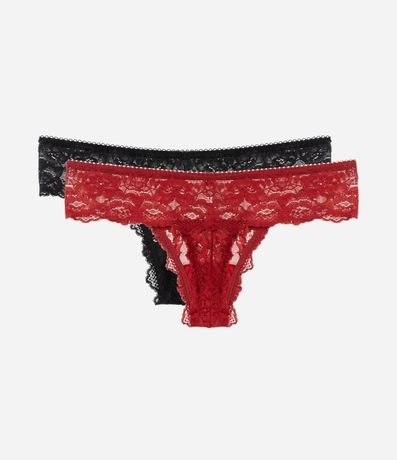 Kit de 02 calcinhas biquínis confeccionadas em renda de poliamida e elastano, com lacinho no cós além detalhe destacado na região frontal. O tecido desta renda possui aspecto floral devido ao modo especial de sua confecção.