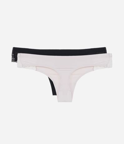 Kit com duas calcinhas de microfibra sem estampa. As peças são modelo biquíni fio e têm detalhe em renda.