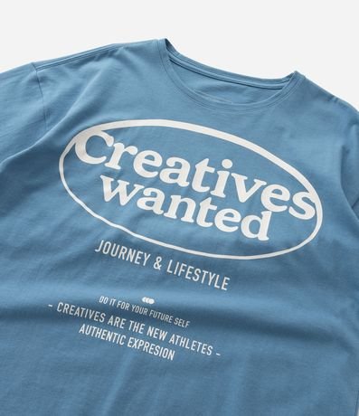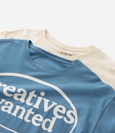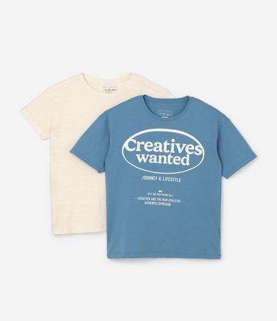 Ref: Kit com 02 camisetas infantis confeccionadas em algodão mais sustentável através de boas práticas ambientais, no modelo regular. Com gola redonda, mangas curtas, 01 com estampa lettering "Creatives wanted" e 01 sem estampa e com etiqueta aplicada na barra.