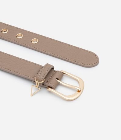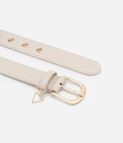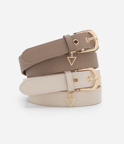 Ref: Kit com 02 cintos femininos confeccionados em material sintético, com largura de 3cm e em duas diferentes cores. Possuem fivela metalizada, passante e detalhe de pingente em formato de triângulo.