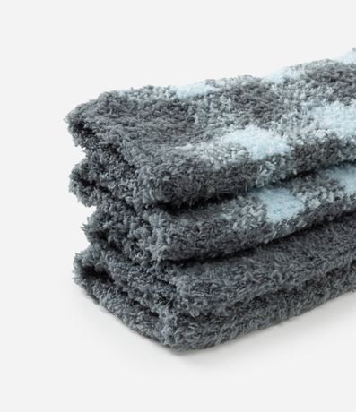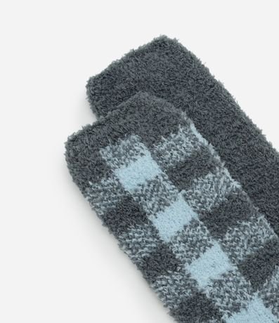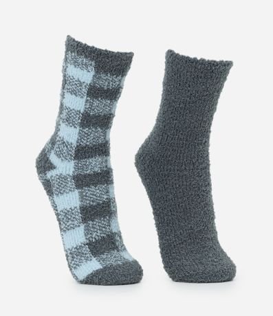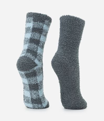 Ref: Kit com dois pares de meias de cano alto feminino, confeccionadas em chenille. Um par possui estampa xadrez em blocos grandes, e o outro é totalmente liso. As duas têm cano levemente canelado, estrutura felpuda e toque aconchegante, ideais para manter os pés aquecidos em dias frios.