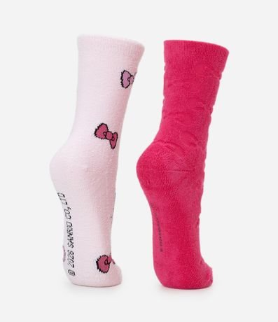 Kit com dois pares de meias de cano alto confeccionadas em chenille. Um par traz estampa da personagem Hello Kitty. O outro par é liso, com efeito embossed de laços em relevo. Ambos possuem toque felpudo, cano levemente canelado e ajuste confortável, ideais para manter os pés aquecidos.