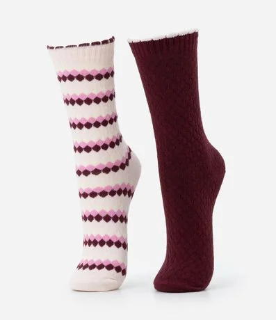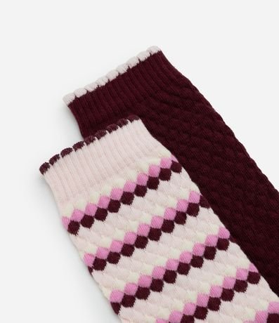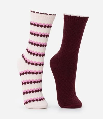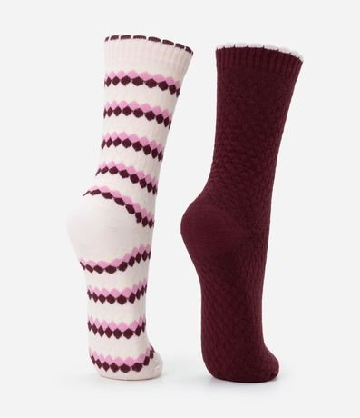 Ref: Ki com 02 pares de meia feminina cano médio confeccionada em algodão mais sustentável. Oferece toque macio e ajuste confortável. O kit acompanha dois pares: um com listras em padrão geométrico e outro com superfície lisa em textura discreta.