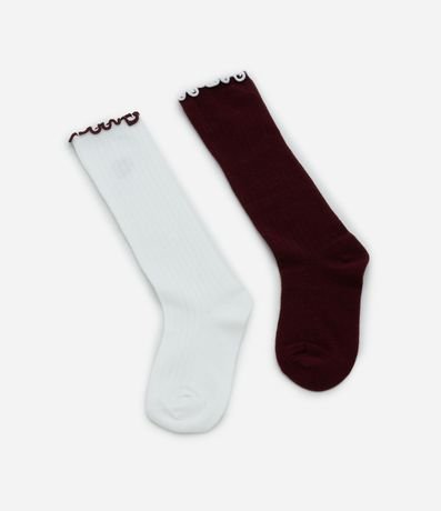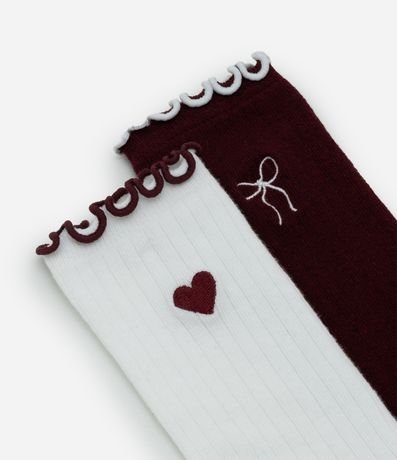 Ref: Kit com duas meias infantis confeccionado em algodão certificado BCI, com toque macio e elasticidade confortável. Possui cano alto 3/4, acabamento com picueta no topo e bordados delicados de coração e lacinho, ideal para compor looks com vestidos e saias.