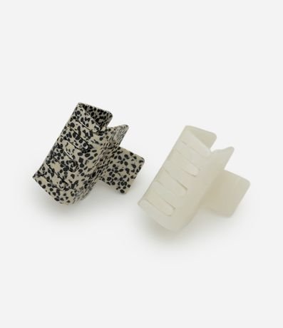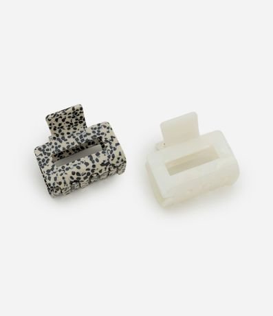 Kit com 02 piranhas de cabelo confeccionadas em plástico com acabamento tipo acetato. Possuem formato retangular, uma peça lisa na cor off white e outra com estampa animal print, ambas com acabamento levemente fosco e visual moderno.