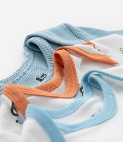 Kit com 03 bodies infantis confeccionado em algodão mais sustentável, gola americana, manga longa, fechamento no entrepernas. 01 peça não possui estampas, e 02 peças possuem estampa de carrinhos.