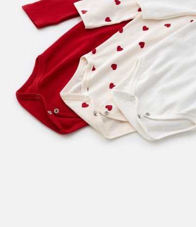 Kit com 03 bodies infantis confeccionados em algodão mais sustentável, gola americana, manga longa, fechamento no entrepernas. 01 peça não possui estampas, e 02 peças possuem estampa de corações e cerejinhas.
