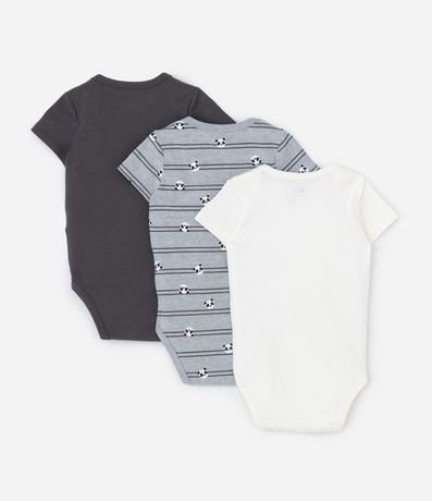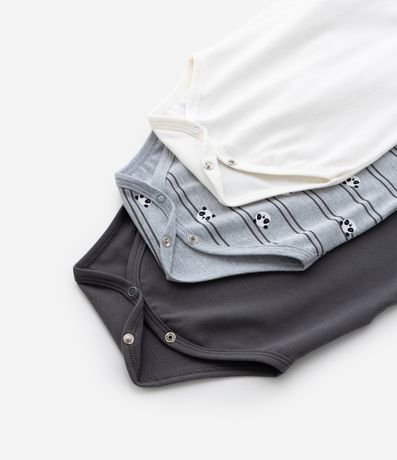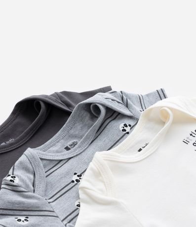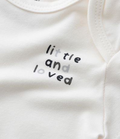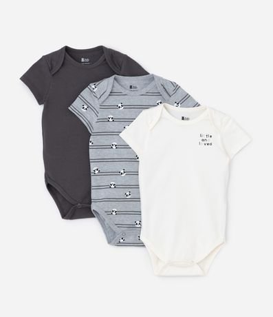 Ref: Kit com 03 bodies infantis confeccionados em cotton mais sustentável através de boas práticas ambientais, gola americana, manga curta, fechamento no entrepernas. 01 peça não possui estampas, 01 peça possui estampa de pandinha e listras e 01 peça possui lettering "Little and loved".