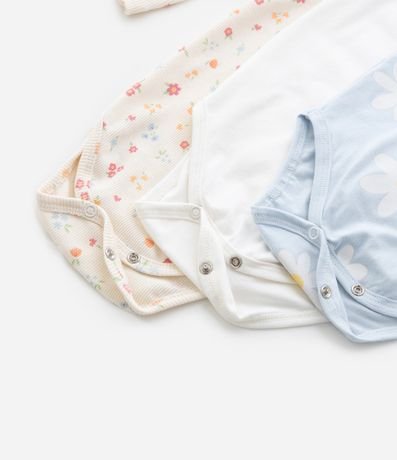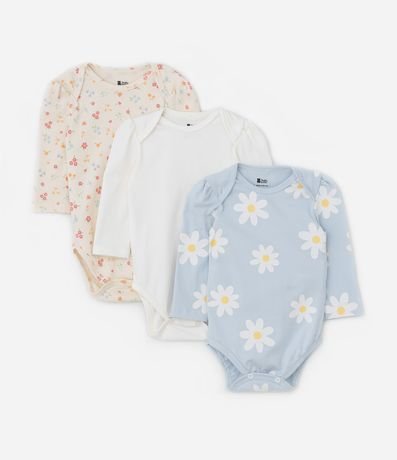 Kit com 03 bodies infantis confeccionados em algodão mais sustentável, gola americana, manga longa, fechamento no entrepernas. 01 peça não possui estampas, e 02 peças possuem estampa de florzinhas delicadas.