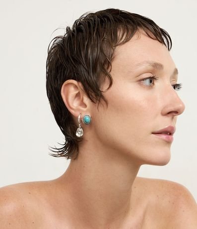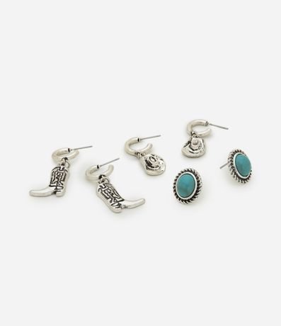 Ref: Kit com três brincos confeccionados em metal reciclado com banho prata envelhecida. Inclui duas argolas com pingentes de bota e chapéu e um botão com aplicação de resina verde. Charmoso e versátil.