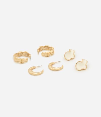 Ref: Kit de brincos com três unidades sendo uma argola fina, uma argola com textura e um brinco orgânico esmaltada.