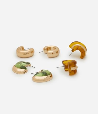 Ref: Kit 03 brincos femininos no modelo argola com cores e formas diversas. Produto confeccionado em metal reciclado.