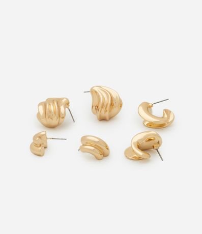 Ref: Kit com 3 brincos de argola em banho Light Gold, com formatos variados e acabamento moderno.