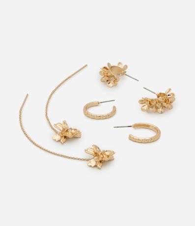 Kit com 03 pares de brincos em metal, modelo fio e argola, com flores e texturas.