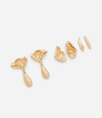 Ref: Kit de brincos femininos em metal reciclado. O conjunto inclui três pares: um par pequeno em formato de pétala, um par em formato de folha e um par em formato de flor. Todos os brincos possuem fecho de tarraxa e apresentam superfície irregular, destacando o relevo do metal.