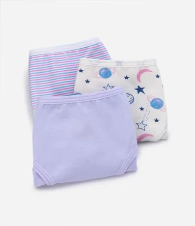 Ref: Kit com 03 calcinhas infantil em cotton, modelinho larguinho e com estampas variadas, uma lisa, uma listradinha e outra com estampa de espaço.
