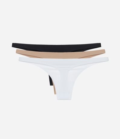 Kit com três calcinhas de microfibra sem estampa. As peças tem as laterais finas e fio dental no bumbum.