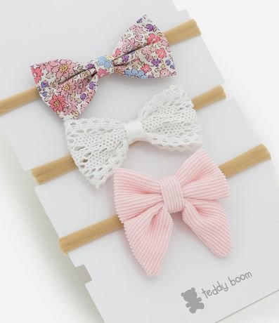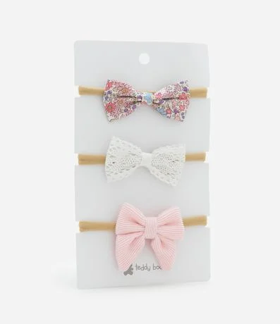 Kit com 03 faixas de cabelo para bebês, com lacinhos aplicados de textura e estampas diversas.
