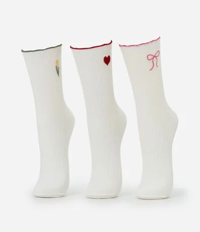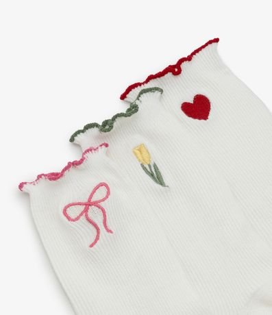 Kit com três pares de meias de algodão BCI caneladas. A peças têm cano alto, barra com acabamento frufru contrastante e cada uma com bordado delicado diferente - topinho, flor e coração.