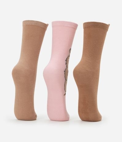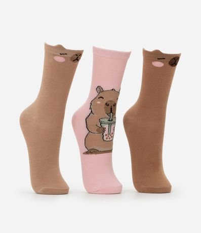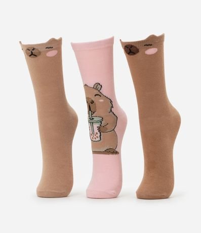 Ref: Kit com três pares de meias de algodão com cano alto. Um par tem estampa de capivara tomando milk shake e outros dois têm recorte de orelhinhas e estampa de carinha no punho.
