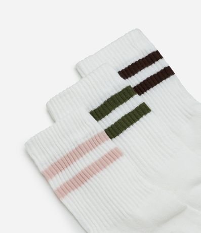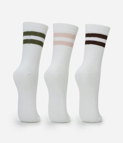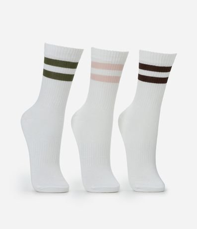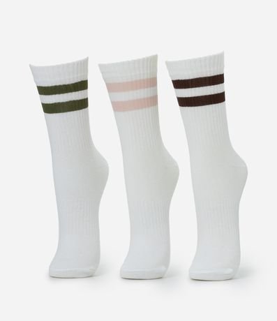 Ref: Kit com 03 meias femininas confeccionadas em algodão mais sustentável. Modelo cano alto, com punho canelado e estampa de listras, garantindo estilo moderno e conforto.