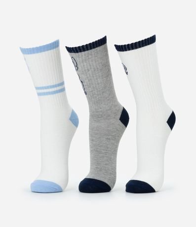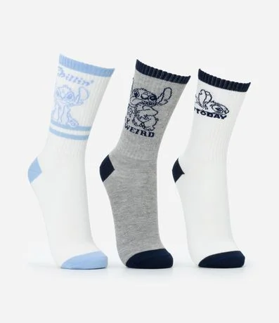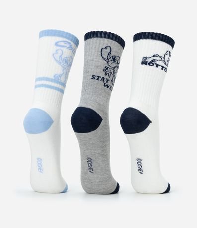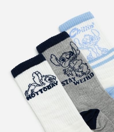 Ref: Kit com três pares de meias confeccionadas em algodão mais sustentável, com cano médio. Cada par tem uma cor, listras no cano e estampa do Stitch.