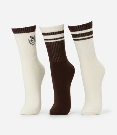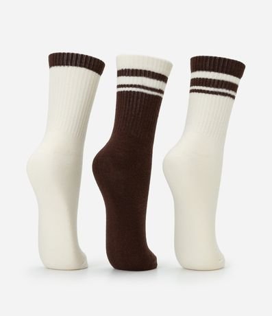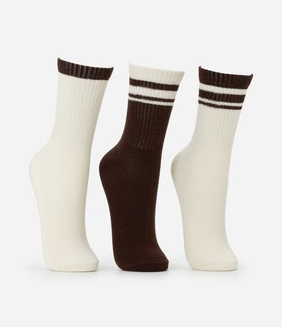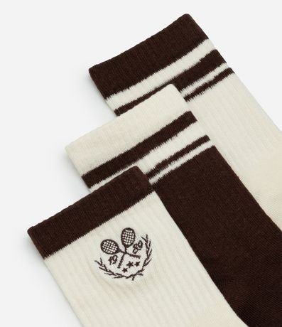 Kit com três pares de meias esportiva feminina de cano alto confeccionadas em algodão certificado Bci. Um par apresenta bordado de raquetes na lateral e os outros dois possui listras no punho. Todas têm cano canelado que ajuda na fixação, além de calcanhar e ponta reforçados. Ideais para uso diário e atividades esportivas.