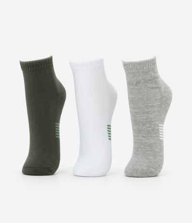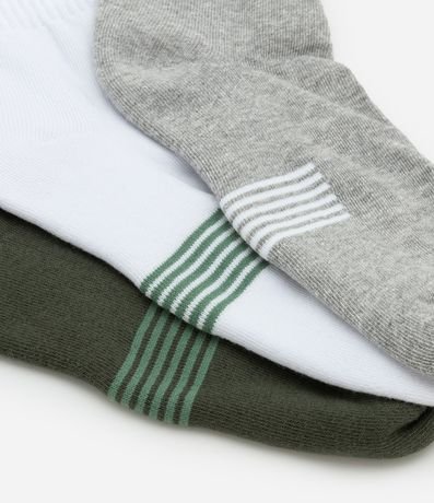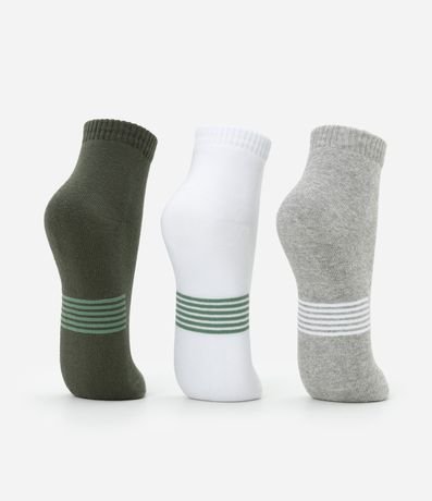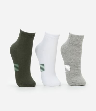 Ref: Kit com três pares de meias esportivas confeccionadas com algodão BCI e seguindo boas práticas ambientais. As peças têm cano curto e estampa de listras na sola.