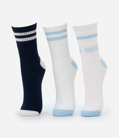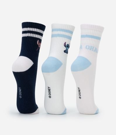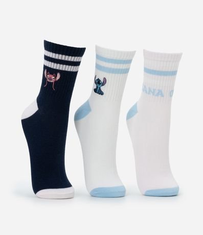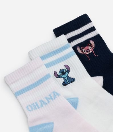 Ref: Kit com três pares de meias de algodão com cano médio. Cada par tem uma cor, listras no cano e bordado do Stitch, Angel ou "ohana".