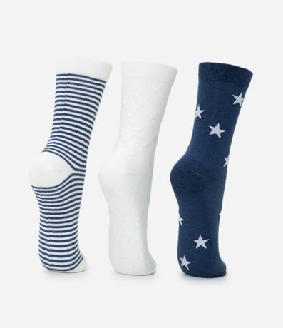 Ref: Kit com três pares de meias femininas de cano médio confeccionadas em algodão mais sustentável. Cada par apresenta um visual diferente: listras horizontais, padrão de estrelas e textura geométrica discreta.