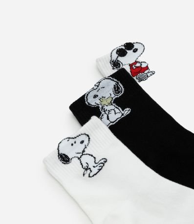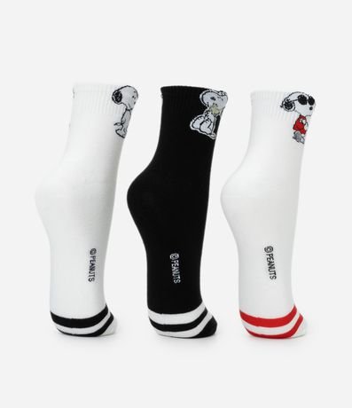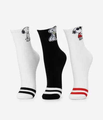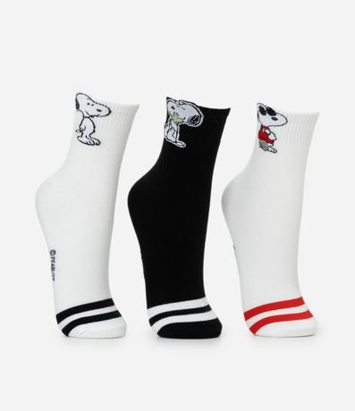 Kit com três pares de meias cano médio em algodão certificado, com personagens do Snoopy. Em todos os pares, possui listras no peito do pé. Modelos com elasticidade confortável e calce ajustado para uso diário.