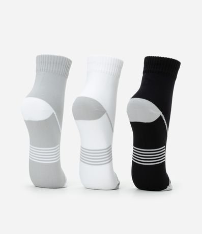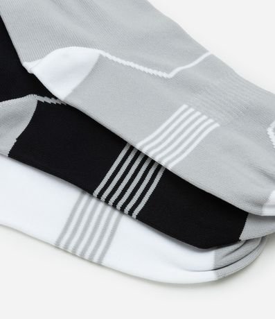 Ref: Kit com três pares de meias esportivas. As peças foram produzidas com poliamida e segui8ndo boas práticas ambientais. O cano é médio e há estampa de listra.