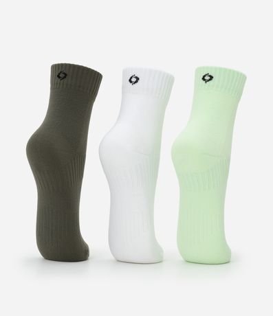 Kit com três pares de meias esportivas confeccionadas em poliamida. As peças têm cano médio e estampa localizada do logo da marca.