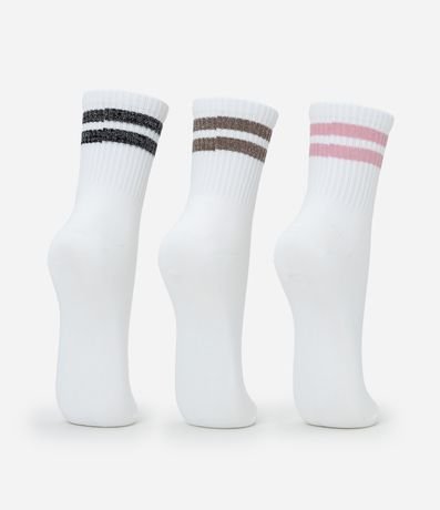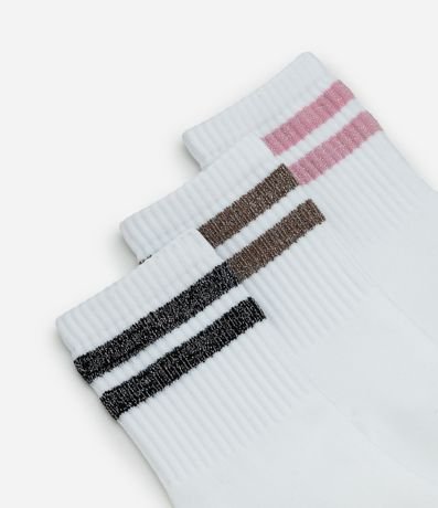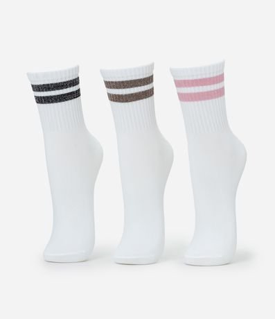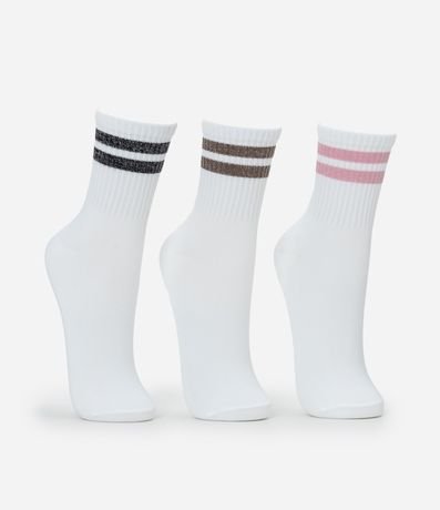 Ref: Kit com 03 meias femininas confeccionadas em poliamida com toque macio e superfície canelada. Modelo cano médio com punho ajustado e listras em fio metalizado contrastante, garantindo visual moderno e confortável para compor looks casuais com estilo.