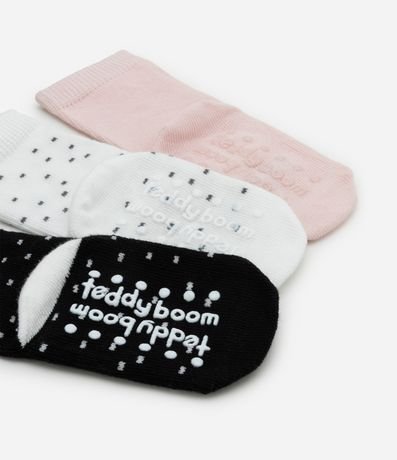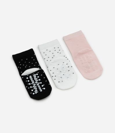 Ref: Kit de meias infantil confeccionado em algodão certificado BCI. Desenvolvidas em meia malha sem terry, possuem punhos ajustados e estampas de caras de bichinho e poá. O conjunto traz visual lúdico e delicado para o dia a dia dos bebês.