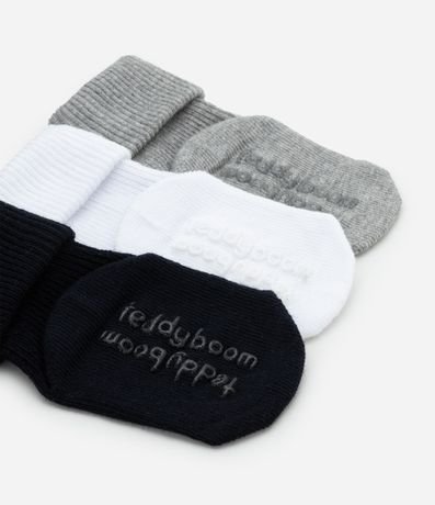 Kit de meias infantis para bebês em algodão mais responsável. Possuem dobra dupla na barra e antiderrapante na sola.
