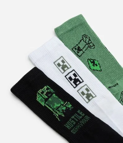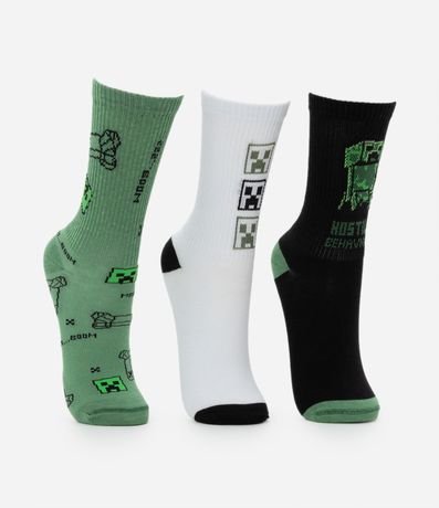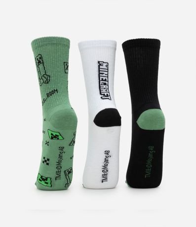 Ref: Kit com 03 pares de meias infantis confeccionadas em algodão mais responsável, com cano alto, textura canelada e estampa do Minecraft.