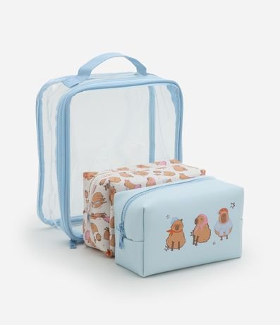 Ref: Kit 03 nécessaires femininas, sendo uma grande quadrada transparente com alça de mão, fechamento lateral por zíper acompanhada por duas médias retangulares com estampa de Capivara.