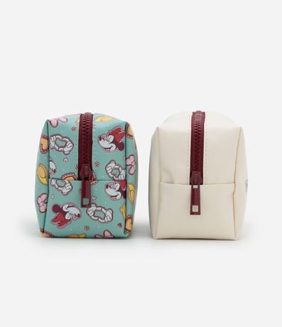 Kit com três necessaires diferemtes: 01 quadrada em PVC transparente, 01 retangular com estampa total de Minnie e 01 retangular com estampa localizada.